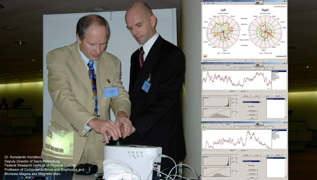 La tecnología de Visualización de Descarga de Gas (GDV) fue desarrollada en Rusia por el equipo del Profesor Konstantin Korotkov en 1995. El dispositivo GDV es un sistema computarizado de última generación que ha reemplazado a la fotografía Kirlian tradicional por varias razones. Una diferencia importante es que permite la visualización y el análisis directos y en tiempo real de los cambios en los campos de energía humanos, ya que los datos se cuantifican y analizan mediante un software sofisticado. Debido a que los resultados se obtienen tan rápidamente, se ha convertido en un «método exprés» para el análisis de energía y estrés. Lo más importante es que, dado que esta tecnología y los protocolos utilizados están estandarizados, los resultados de GDV obtenidos por diferentes investigadores se pueden comparar con alta confiabilidad. Los resultados se interpretan en función de las conexiones energéticas de los dedos con diferentes órganos y sistemas a través de meridianos que se han utilizado en la acupuntura y la medicina tradicional china durante miles de años.